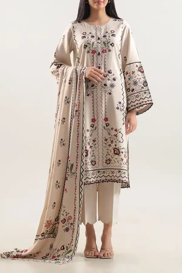 Unstitched cotton khaddar 3pc ivory color suit Rs:2,999.