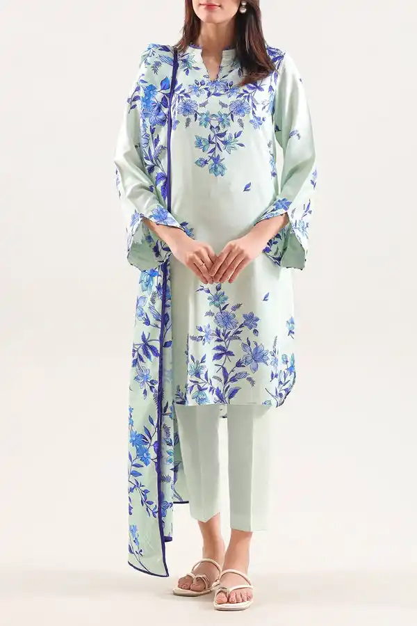 Aqua color Printed cotton khaddar Unstitched 3piece suit Rs:3,499 only.