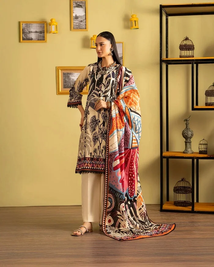 3 piece karandi linen off-white color digital printed suit Rs:8,900 Rs:6,230 only.