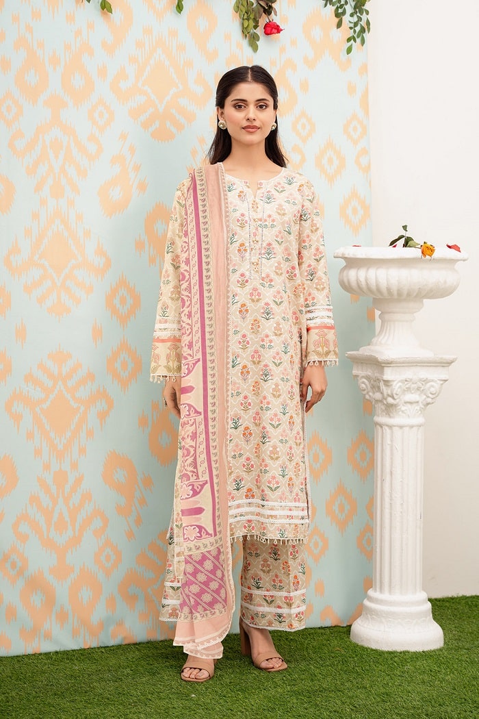 Lawn unstitched floral printed beige color for Rs:6,600 Rs:3300 only.