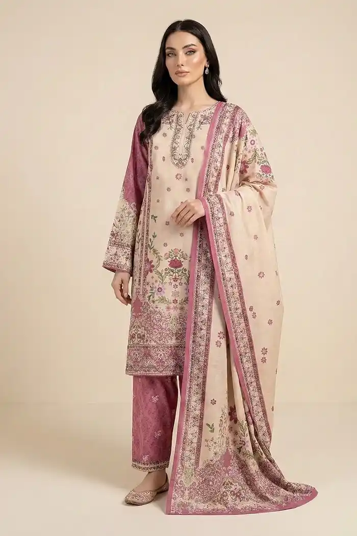 Tea Pink Color digital printed embroidered three piece khaddar suit Rs: 9,300 Rs:4,650.