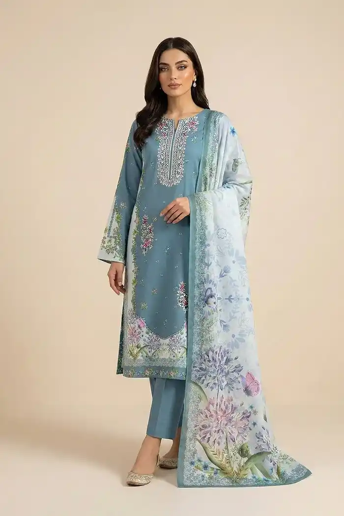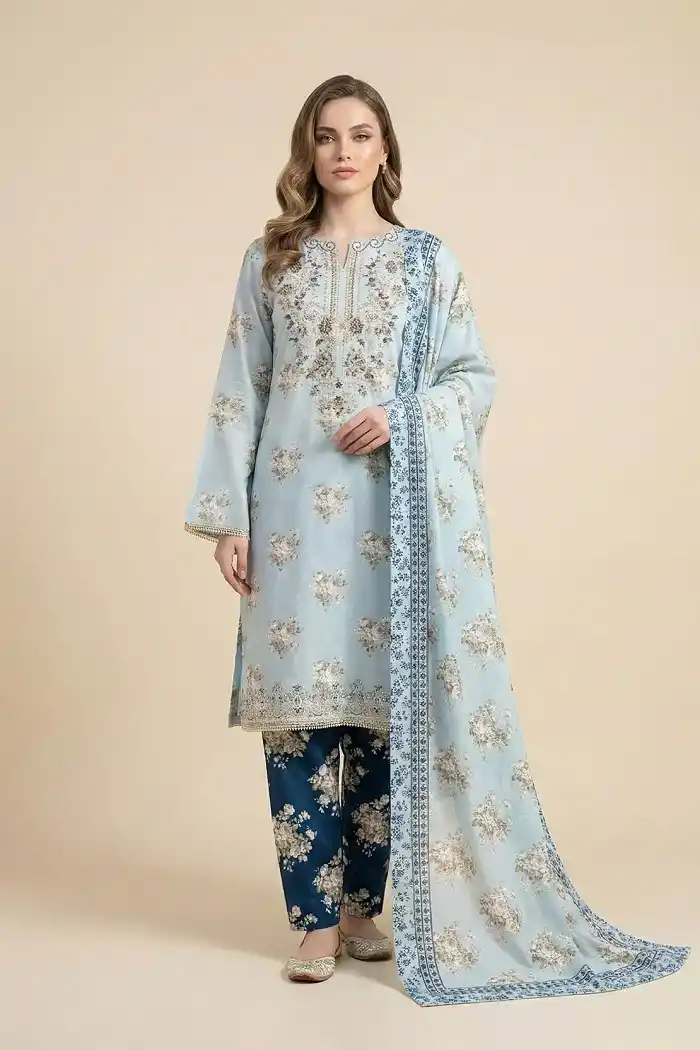 Digitally printed sky blue color lawn three-piece embroidered suit Rs:5,650 Rs:4,520 only.