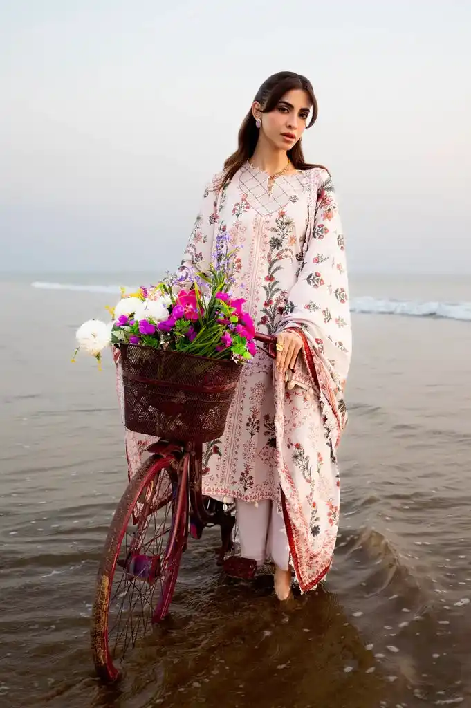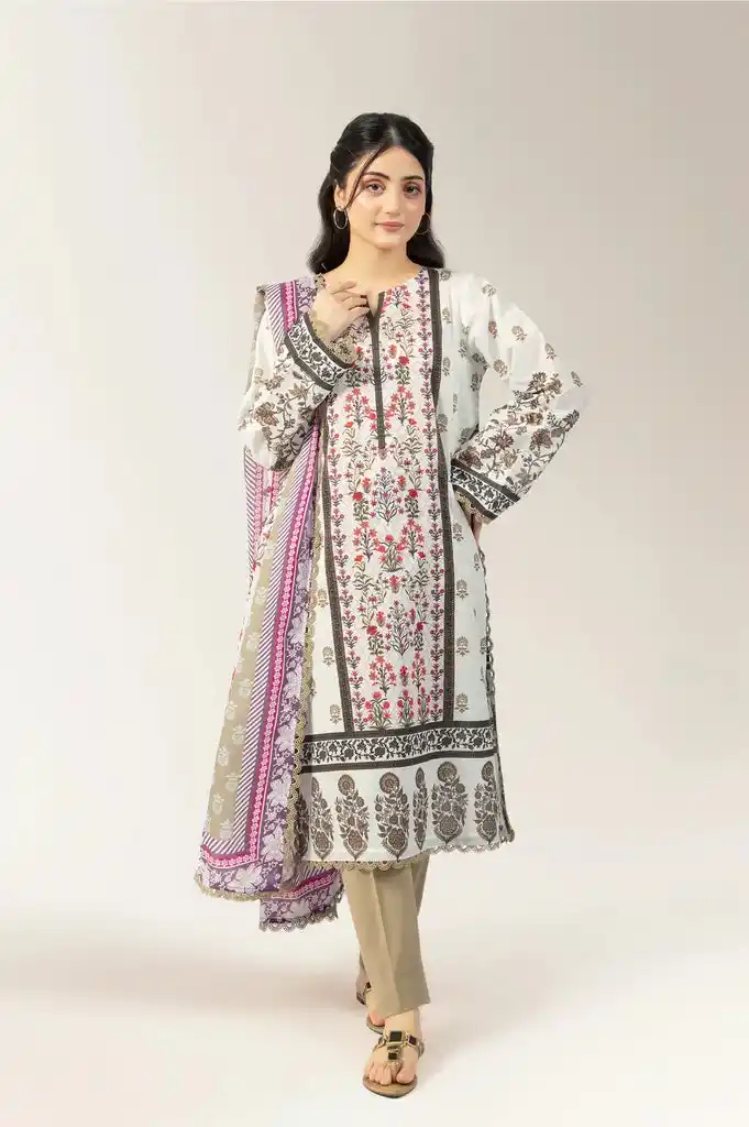 White lawn 3pc printed unstitched suit Rs:3,990 Rs:2,993 only.