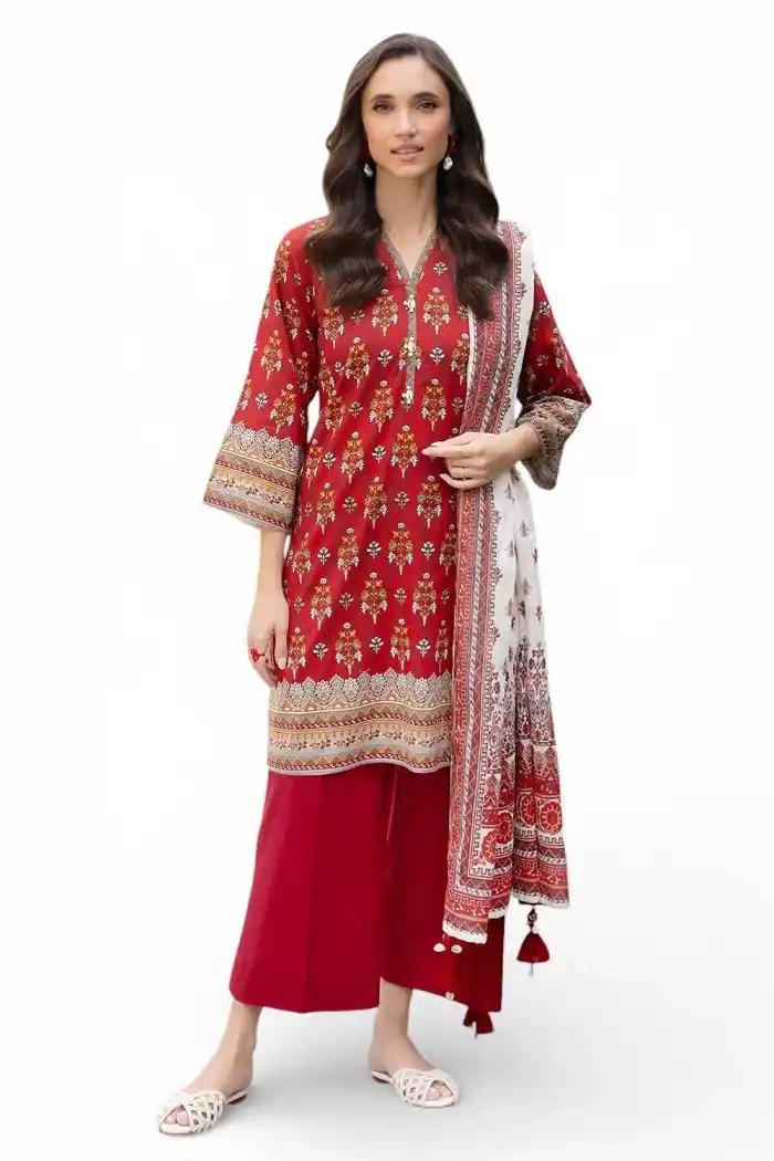 Let’s update your summer wardrobe with this lawn-printed red color suit PKR:3,990.