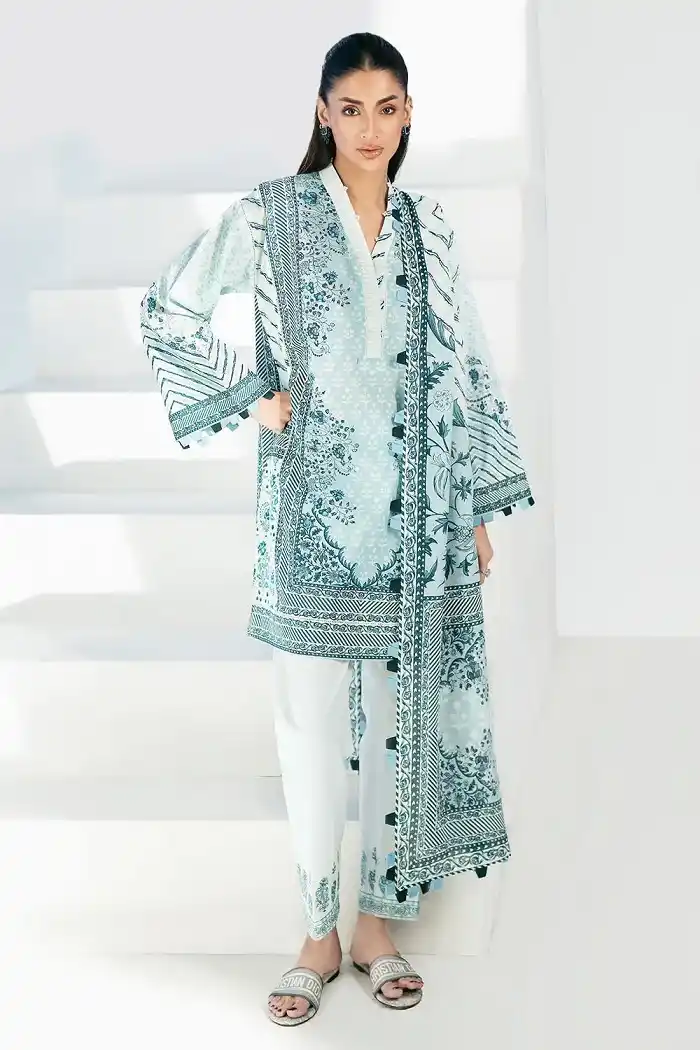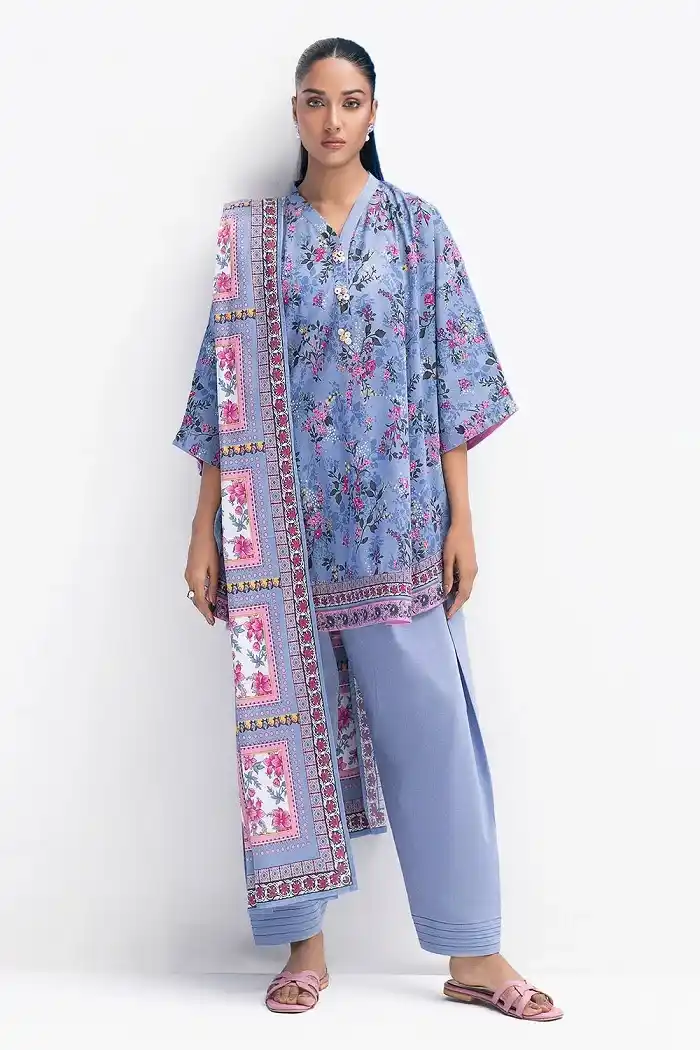 Printed lawn unstitched embroidered blue 3-piece suit with dobby dupatta available for PKR:5,890 PKR:4,712 only.