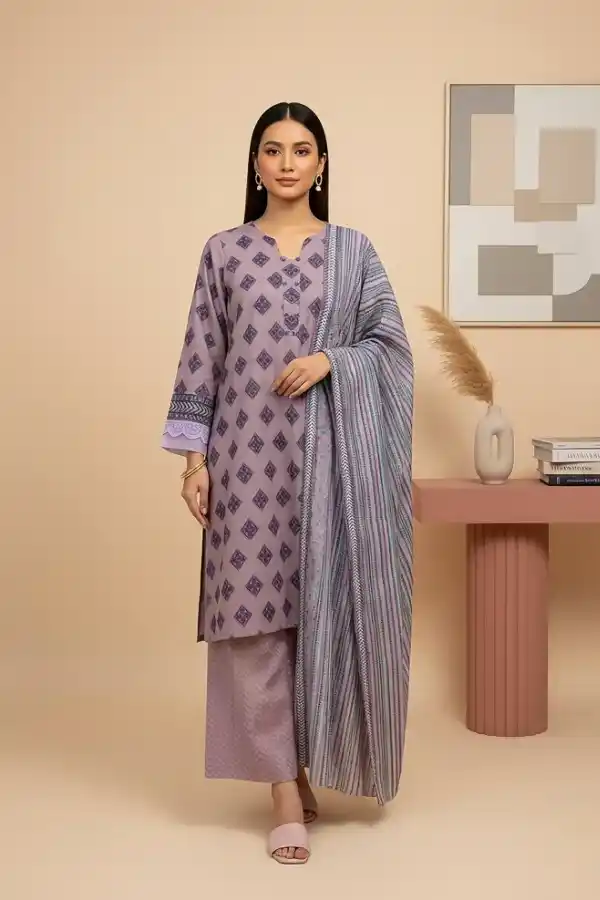 Lilac color printed 3 piece premium khaddar suit Rs:5,995 Rs:4,792.