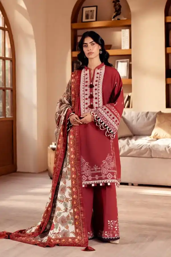 Printed & embroidered khaddar 3 piece red color suit Rs:7,695 Rs:4,617.