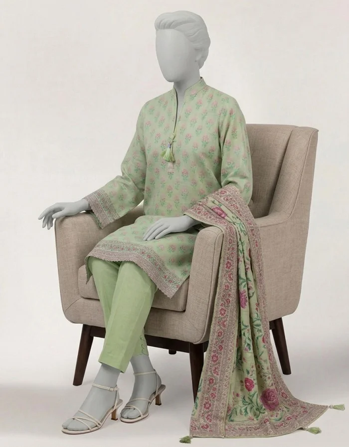 Light green color khaddar printed unstitched three piece suit Rs:4,490 Rs:2,245.
