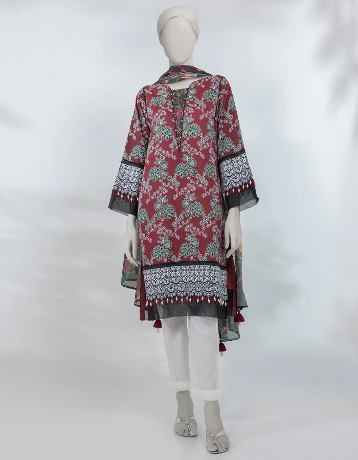 Maroon lawn printed summer 3 pc suit for women Rs:3,490 Rs:2,618 only.