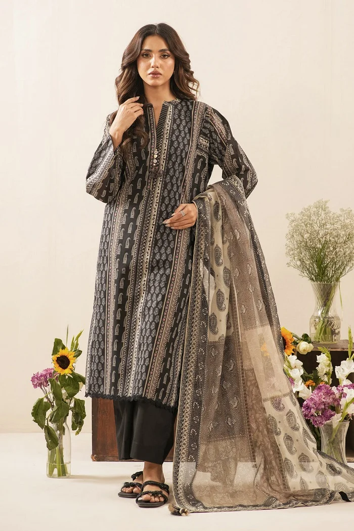 Get a glamorous eid look with this black color printed lawn 3-piece suit for Rs: 3,990.