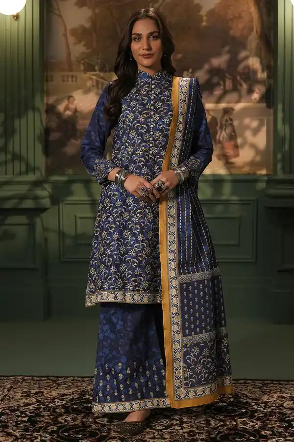 Navy blue color printed 3pc unstitched khaddar suit Rs:2,490 only.
