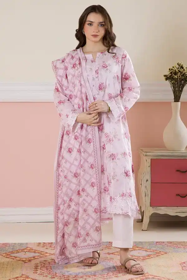 Summer floral digital printed 3-piece traditional pink embroidered stitched suit Rs:4,490.