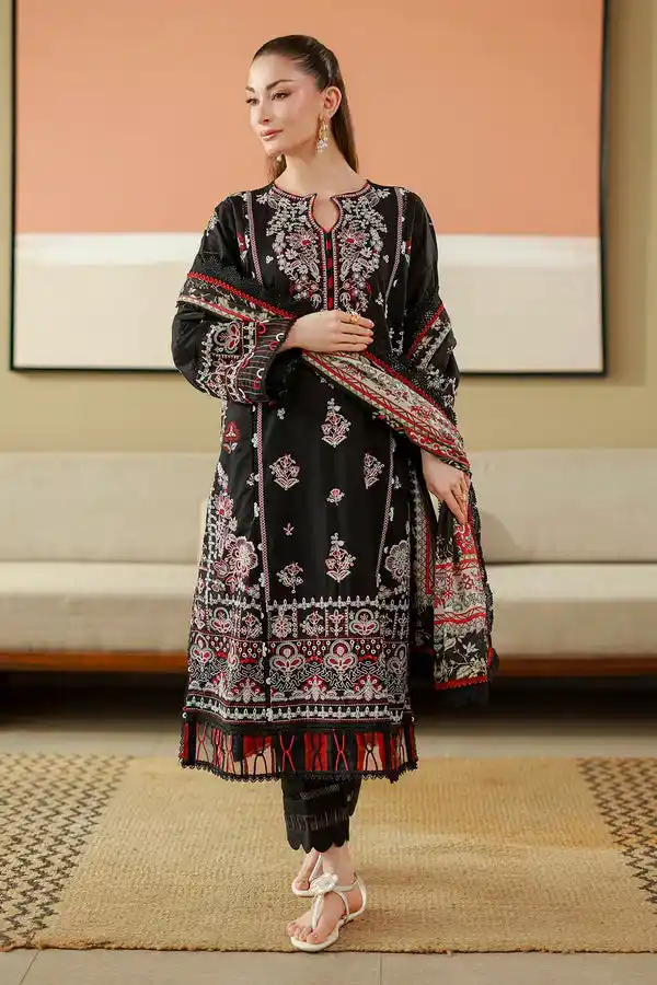 Upgrade your wardrobe with zellbury stunning 3 piece embroidered black color high quality comfort and durable suit Rs:4,990.
