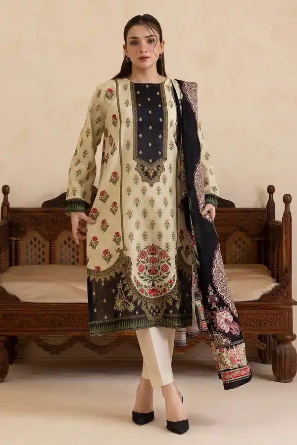 Beige & black color printed khaddar 3 pc suit available for Rs:2,990.