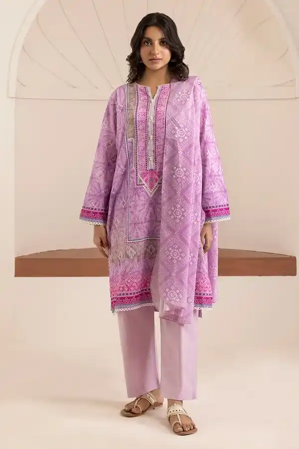 Digital printed pink color ready-to-wear khaddar three piece suit Rs:3,990.